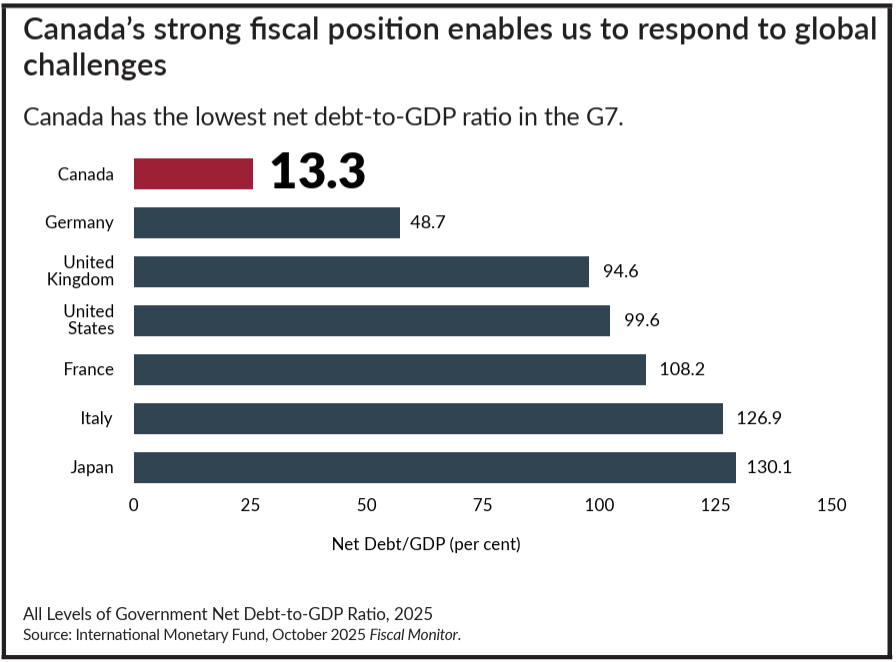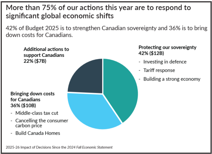 Nothing in this budget is surprising, as most of it has been telegraphed in recent weeks. The budget asserts that “the global trade landscape is changing rapidly, as the United States reshapes its economic relationships and supply chains around the world. The impact is profound—hurting Canadian companies, displacing workers, disrupting supply chains, and creating uncertainty that holds back investment. This level of uncertainty is greater than what we have seen in recent crises. Budget 2025 makes generational investments while maintaining Canada’s strong fiscal advantage—a foundation that allows us to invest ambitiously and responsibly, and build Canada’s economy to be the strongest in the G-7.”
