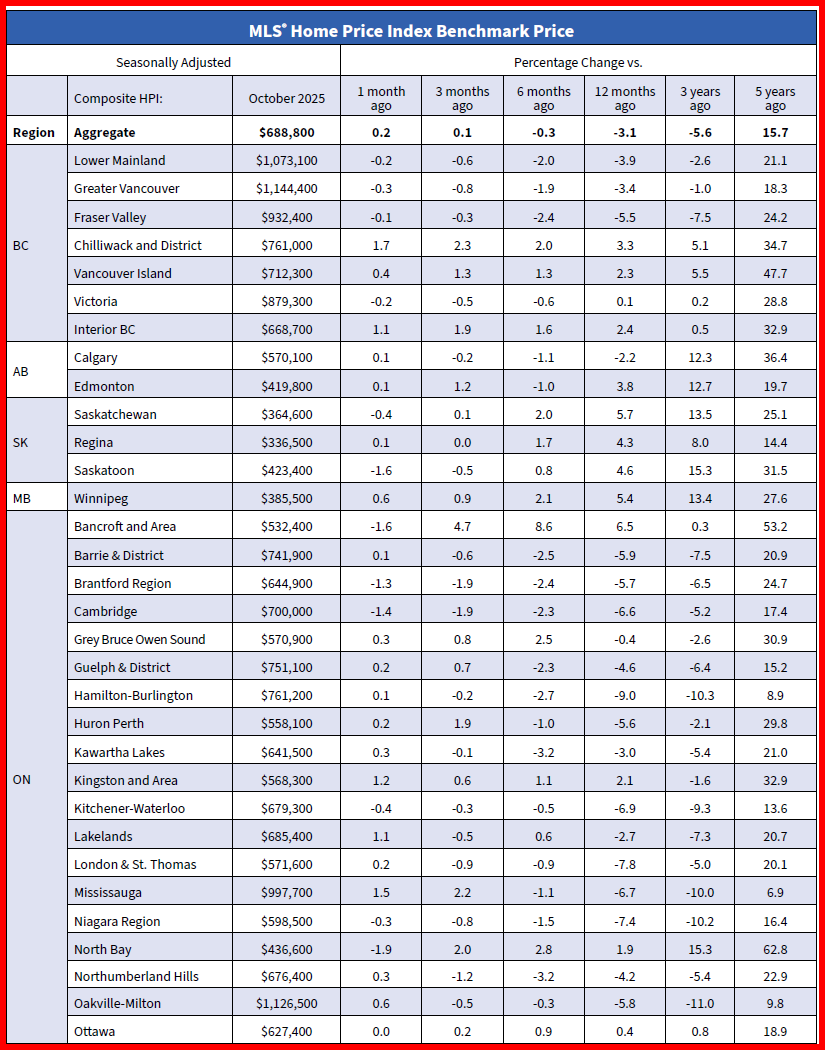 The National Composite MLS® Home Price Index (HPI) edged up 0.2% between September and October 2025. The non-seasonally adjusted National Composite MLS® HPI was down 3% compared to October 2024, the smallest year-over-year decline since March.